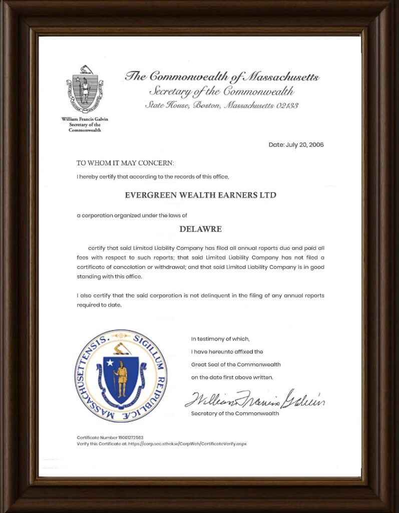 Evergreen Wealth Earners Ltd is a fully registered and certified investment company, recognized for transparency and integrity. Our certificate of incorporation stands as proof of our legal legitimacy and commitment to helping clients Investors their wealth securely.